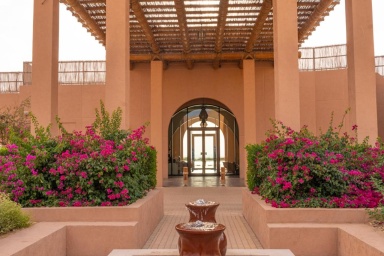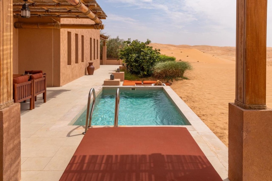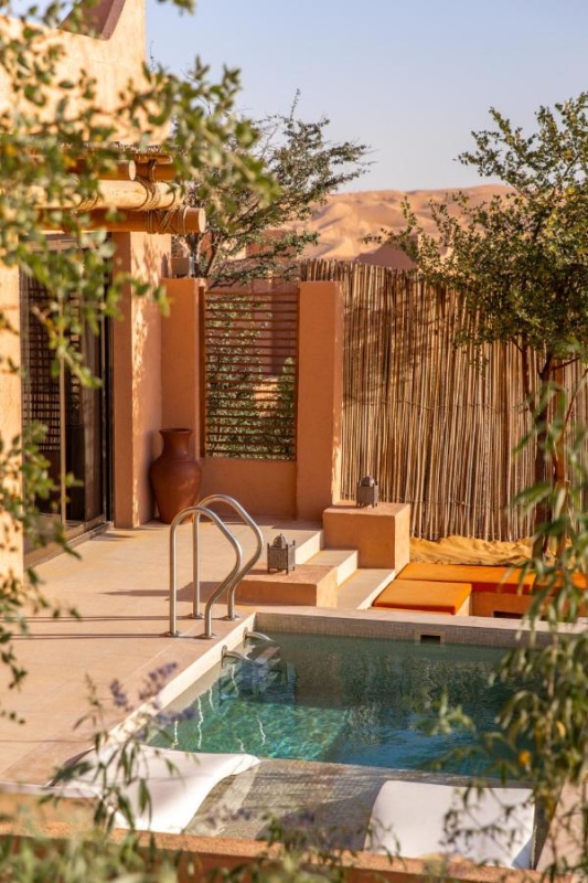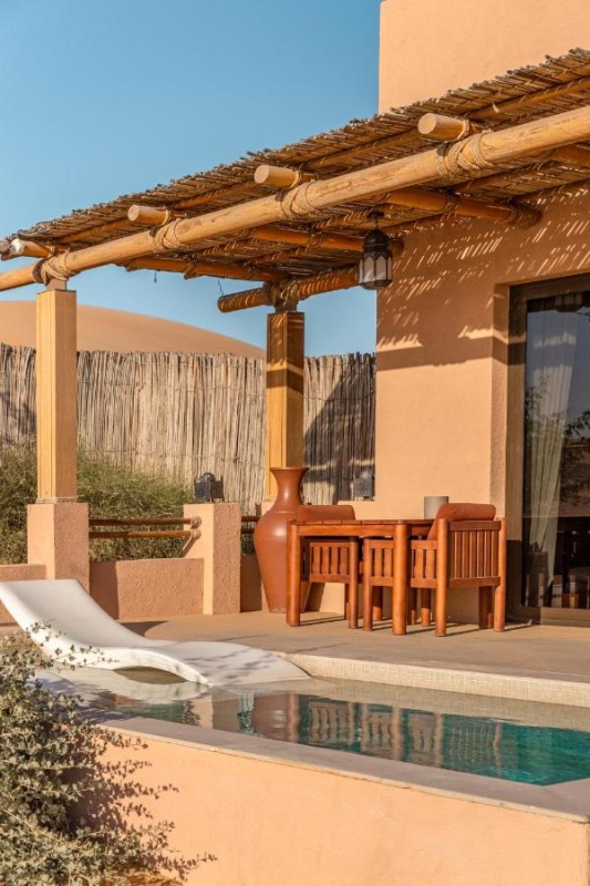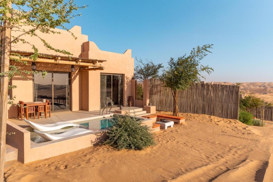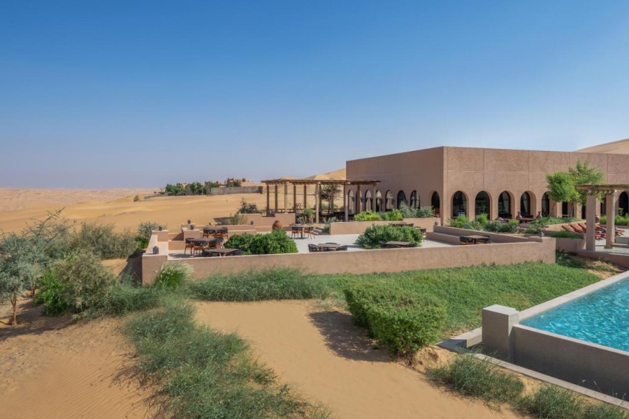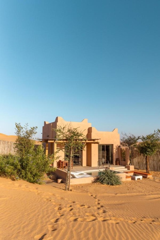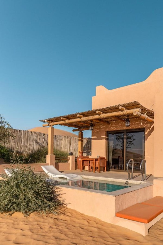 Архитектура курорта органично вписывается в ландшафт: виллы и общественные зоны словно вырастают из песка, создавая ощущение дома посреди пустыни.