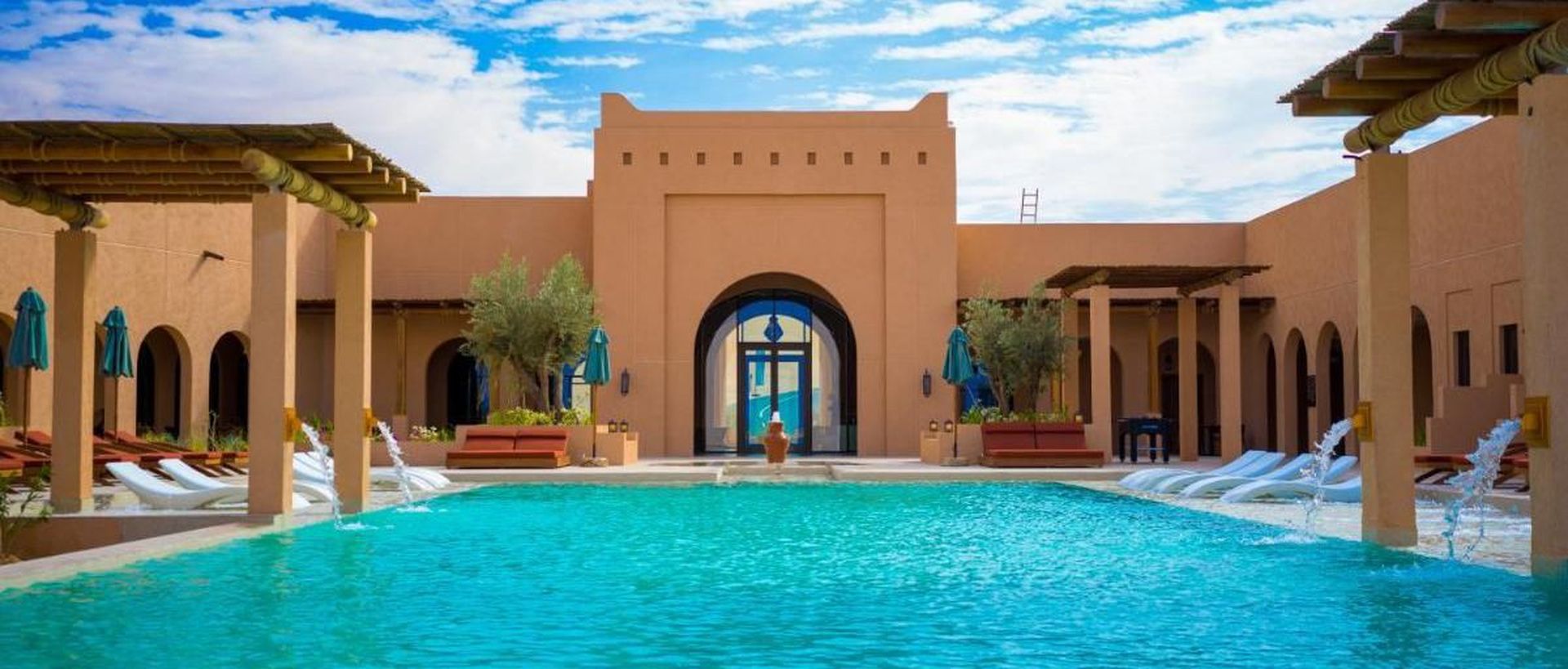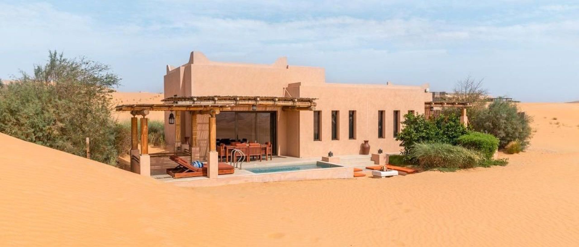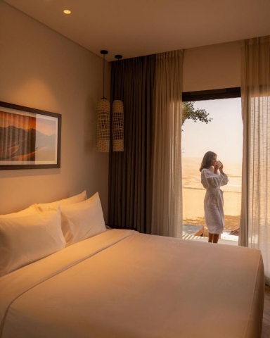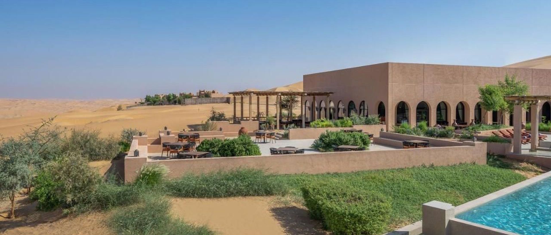 Архитектура курорта органично вписывается в ландшафт: виллы и общественные зоны словно вырастают из песка, создавая ощущение дома посреди пустыни.