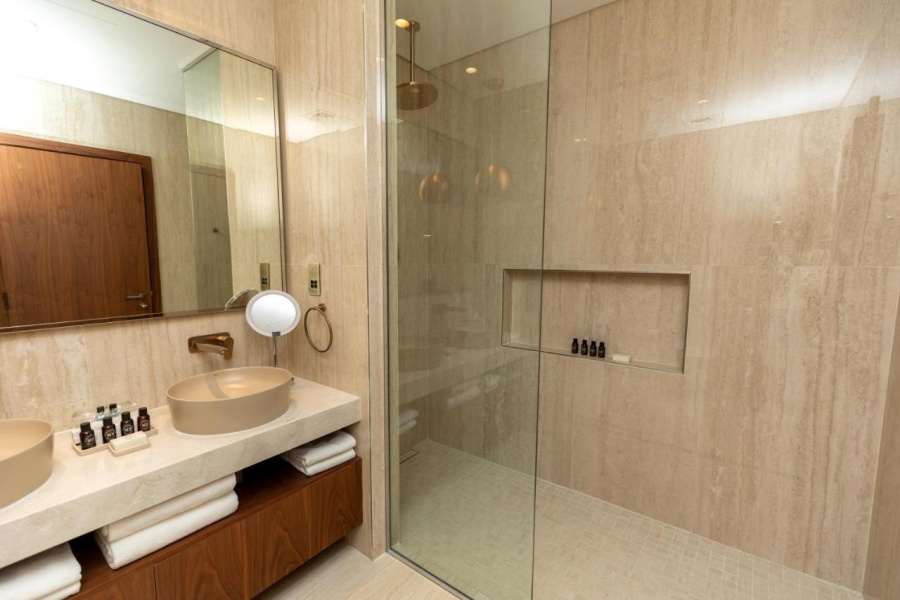 Номер уютный, со всем необходимым, чайник, капсульная кофемашина, бесплатная вода в номере в огромном количестве, банные принадлежности фирмы Amouage, утюг с гладильной доской.Большая красивая территория, внимательное обслуживание на пляже.
